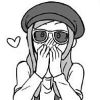 Description: greyscale art of a young woman with light skin and long hair in casual clothes blushing and covering her mouth, a cartoony heart beside her